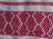 человечества. При украшении ткани геометрические узоры, состоящие из различно разработанных ромбических мотивов, крестов с загнутыми краями S-образными фигурами, выполнялись при помощи старинной техники косой стежёк и набора. Г-образные фигуры, меандр, четырёх – восьмиконечные звёзды, ромбы, прямые и косые кресты, выполненялись в технике крестика и двустороннего шва. Наличие в древнейшем искусстве геометрических форм, определяющих его характер, отмечается многими учёными, историками. Истоки этого явления - в формирующейся способности древнего человека к абстрактному мышлению, в умении живой конкретный предмет превратить в элемент искусства – ритмично-повторящийся узор на поверхности ткани. Связь с древними верованиями сохранилась в традициях вышивки, в тех её качествах, которые сейчас мы, современные люди, воспринимаем как художественные особенности. Все перечисленные геометрические мотивы, по-видимому, являются солнечными знаками и в далёком прошлом считались священными изображениями. Первоначальный смысл давно уже забыт, но фигуры сохранились до нашего времени в качестве излюбленных мотивов орнамента. |